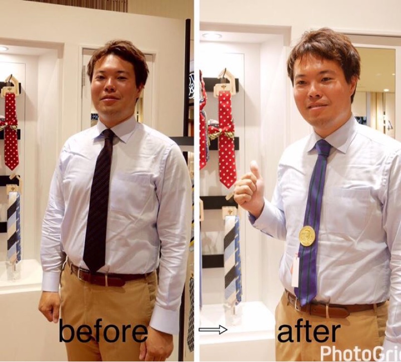 早速、お似合いになるネクタイをつけていただきました。